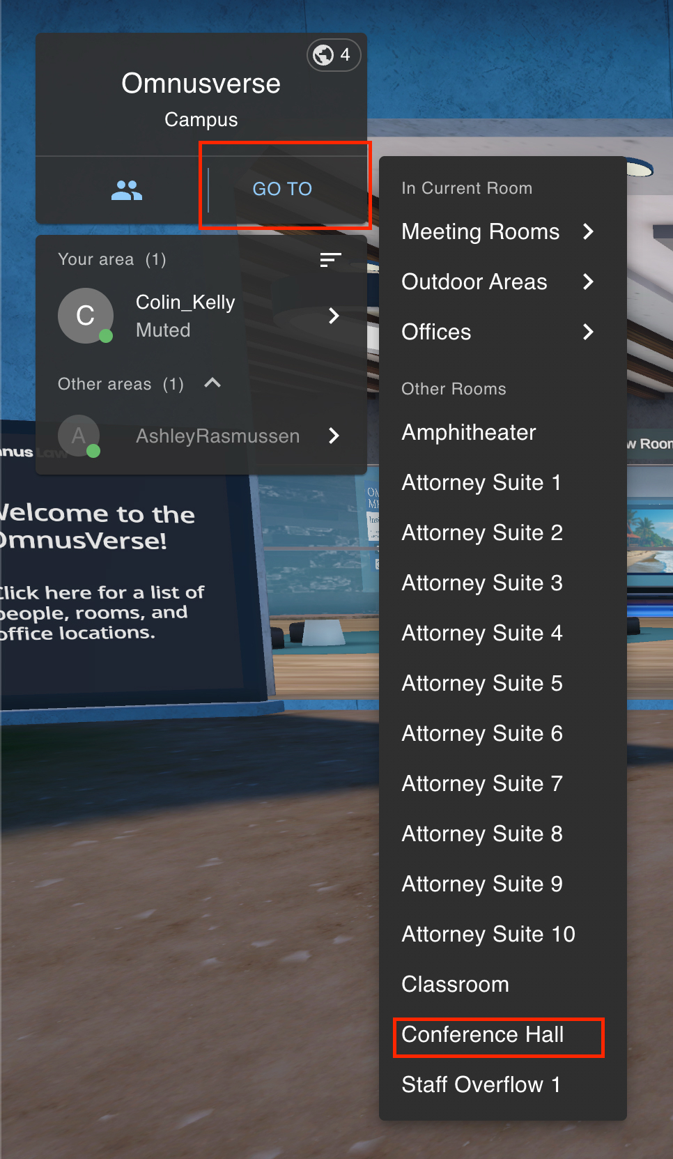 - Click on "Go To" button, then look in the "Other Rooms" area and click on Conference Hall.