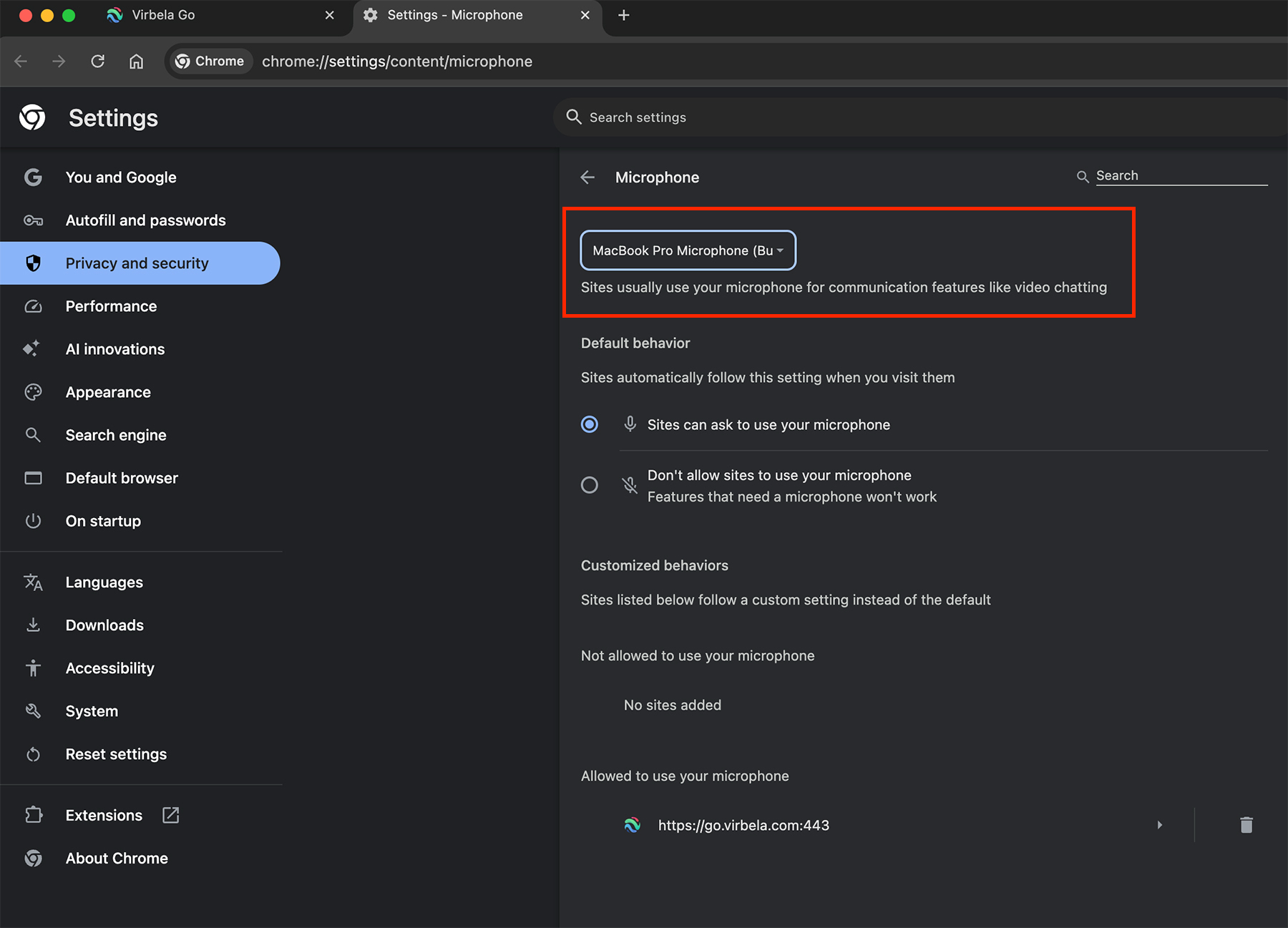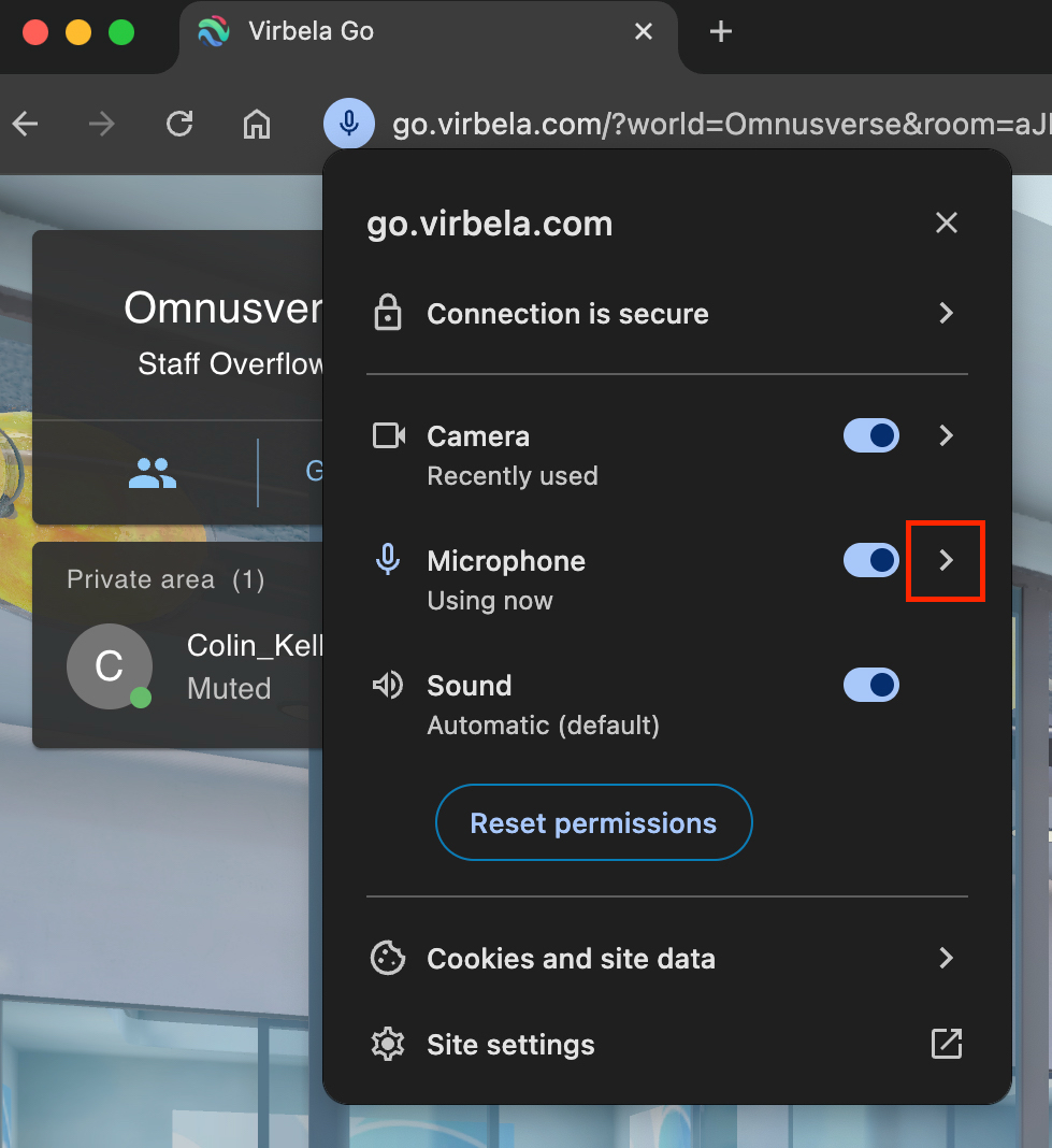 2. Ensure your microphone has permissions toggled on (see screenshot below) and then click the > next to Microphone.