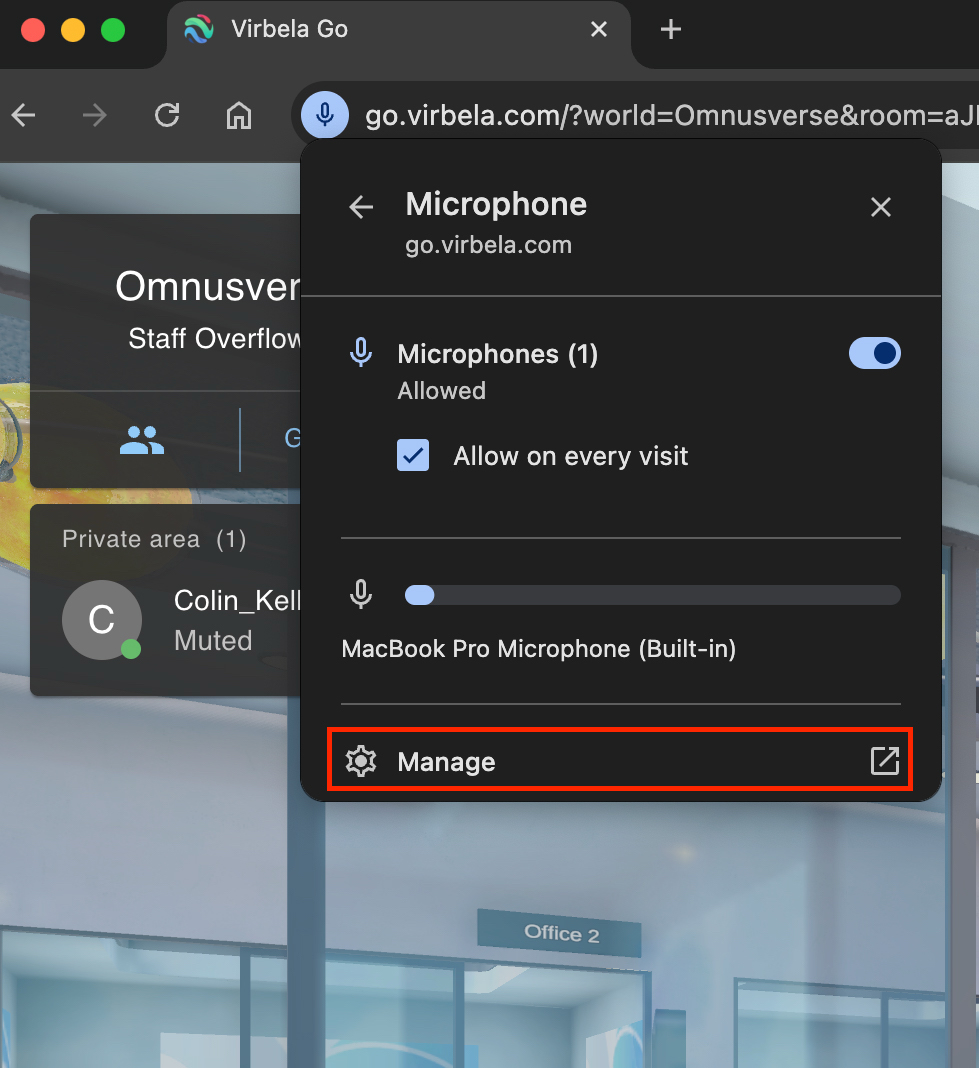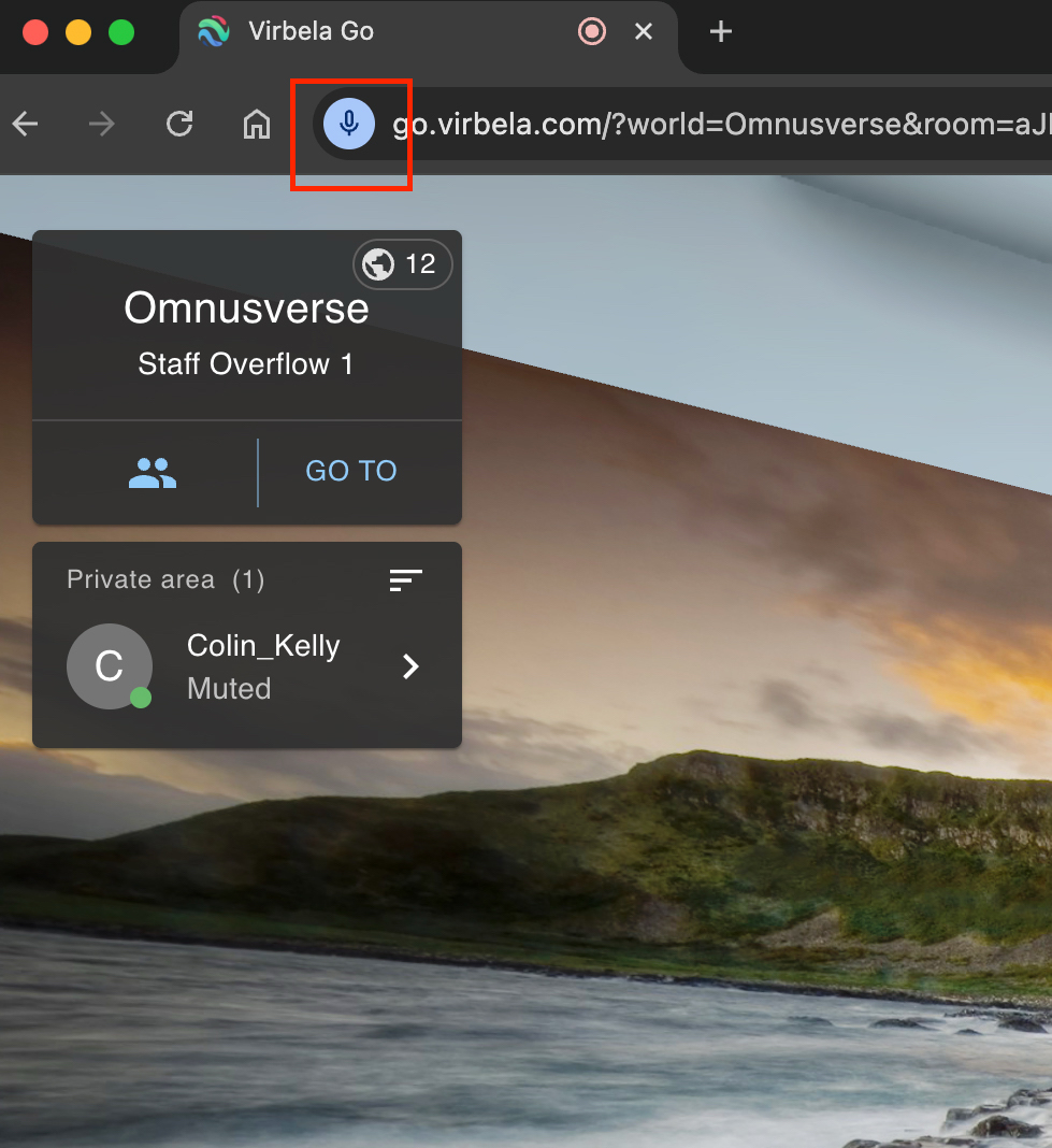 1. While Virbela Go is open, click on the microphone icon in the top left area.